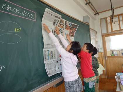 算数の学習で1平方メートルがどれくらいの大きさなのか実感するために,新聞紙で1平方メートルを作りいろいろなものの面積をグループで協力して測っていました。