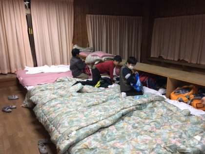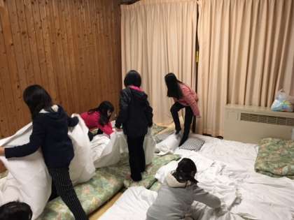 天体観測を終え,宿泊棟に戻ってきて寝具の準備をしています。毛布もしっかりと敷かないと,風邪をひいてしまっては山の家での活動が楽しくなくなってしまいます。あたたかくして寝られますように。