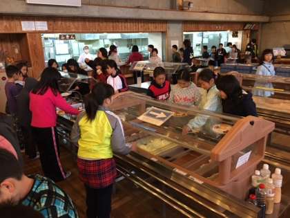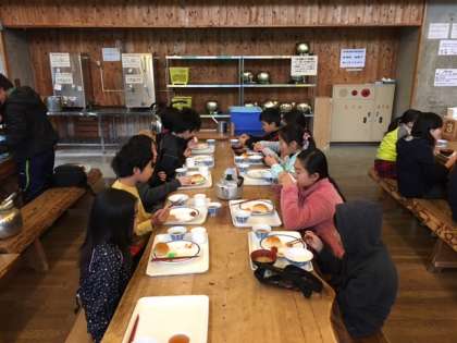 朝の集いの後,朝食を食べています。山の家の食堂で食べる初めての食事です。山の家はバイキング形式ですので,自分で,食べられるものを食べられる量だけお皿にとって食べます。この後の活動は,天狗杉までの登山です。天候があやしいですが,登る予定です。しっかり食べて元気に登ります。