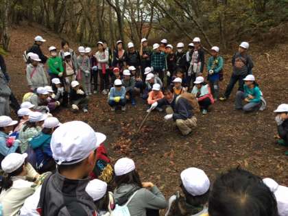 寺山峠を越えて,お弁当を食べる天狗杉へ向かいました。雨には遭わずに済んでいます。途中で山の家の職員の方に猪のヌタ場(人間でいうとお風呂のような所)を教えていただきました。