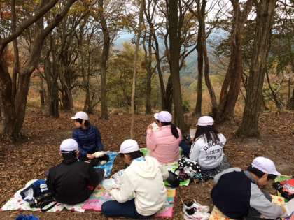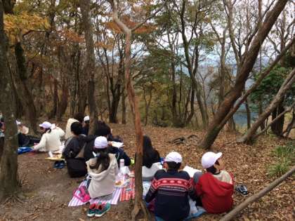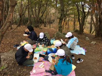 ようやく,天狗杉へ到着しました。待ちに待ったお昼ごはんです。少し風が強く,寒いのですが,全員でお昼を食べることができました。この後は,尾根づたいに歩き,山の家を目指します。