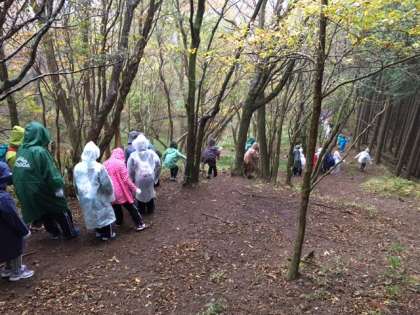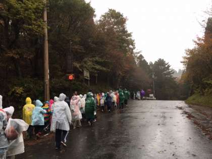途中から雨が降り出しました。雨の中,足元に気を付けながら,山道を進みます。しんどい状況の中で,頼りになるのは仲間の存在です。みんなで心を一つにして,ゴールの山の家を目指しています。