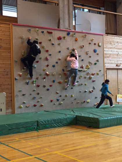 プレイホールでは,クライミングを行っています。壁面に設置された2つの壁を登ります。いろいろな色の取っ手につかまりながら,安全に気を付けて登っています。高い方の壁は,天井に届くほどの高さですが,果敢にチャレンジしている児童もいます。