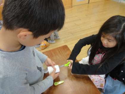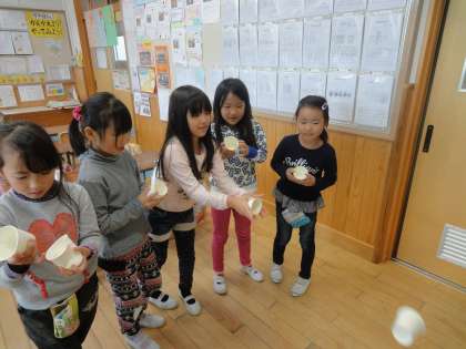 生活科「あそんで ためして くふうして」の学習では,あそびはかせに教えてもらった,動く仕組みのおもちゃの一つ,とぶおもちゃ作りに挑戦しました。試行錯誤しながら,全員がとぶおもちゃを作り上げました。作ったおもちゃで遊んでいるうちに,「かざりづけをしたい。」「友達と競ってシューティングゲームをしたい。」「みんなのコップを重ねてとばしたい。」など,どんどんアイデアが浮かんできたようでした。次の時間は,そのようなアイデアを生かして,おもちゃをレベルアップします。