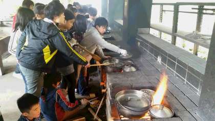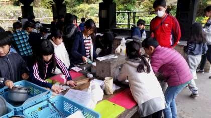 今日の昼食は「野外パーティー」。グループごとに違う料理を作り,みんなでいろんな料理を味わいます。作るのはカレー,シチュー,すき焼き風煮,焼きそばの4種類です。出来上がりが楽しみです。