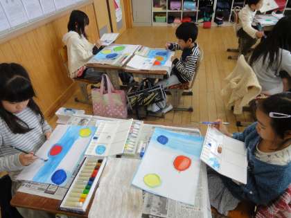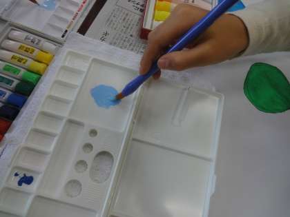 今日は,絵の具の混色をしてみました。青色と白色の絵の具を混ぜて,自分好みの水色を作り,画用紙の広範囲の部分を塗りました。一度作った量では足りず,色が変わらないように,何度か同じ色を作らなければならないので,子どもたちは苦戦していましたが,一生懸命塗ることができました。