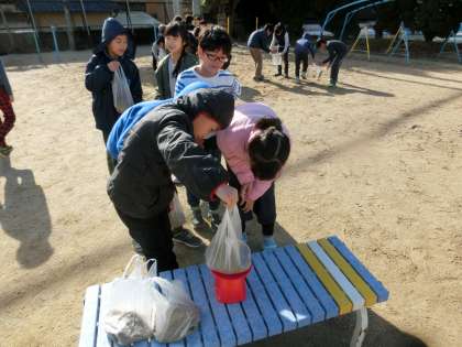 今日は砂場に行って,ビニール袋に砂を入れ,ぴったり1kgをめざすという活動をしました。二人一組になり,相談しながら,一生懸命感覚を研ぎ澄ませていました。