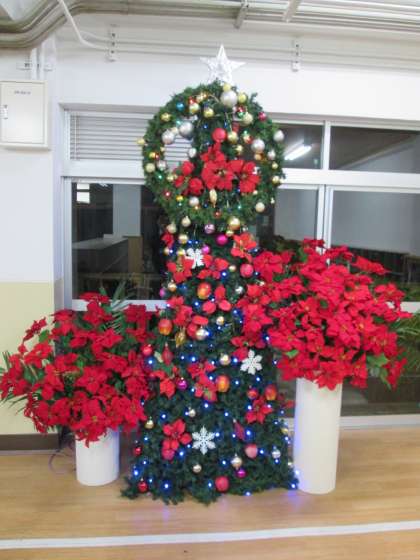たくさんのポインセチアをツリーの脇に設置していただき,豪華なクリスマスツリーになりました。ツリーを見た子どもたちは「うわあ,きれい。」と感嘆の声をあげていました。ありがとうございました。