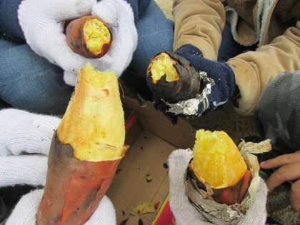 火に入れたサツマイモは,30分ほどでほかほかの焼きいもに。中までほくほくで,とても甘くておいしいです。子どもたちは大喜びでほおばっていました。