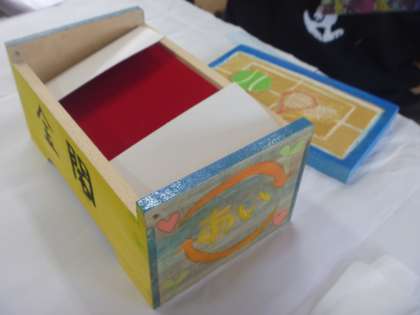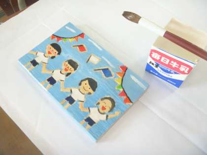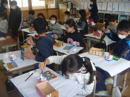 図画工作の時間に,小学校生活最後の作品として,木彫オルゴールづくりを進めています。好きなものや好きなこと,思い出などを描き,彫刻刀で彫った後,色付けをします。今日はニスを塗って,徐々に仕上がってきました。