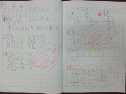 小数のまとめに入っています。練習問題に取り組み,習熟を深めました。1マス1文字。丁寧に書いて,うっかりミスをなくすことを目標にがんばっています。