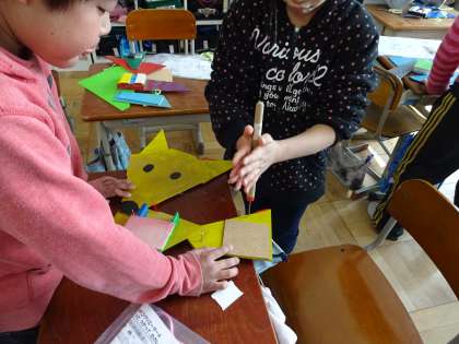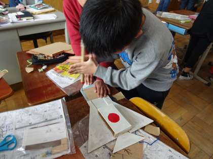今日の図画工作の時間には,初めて「きり」を使って板に穴をあけ,ひもを通して完成させました。今回のこの学習では,初めて「のこぎり」を使ったり,ニスを塗ったりしました。どの作品もがんばって作っています。ぜひ,持ち帰った際には,部屋に飾って使ってほしいと思います。