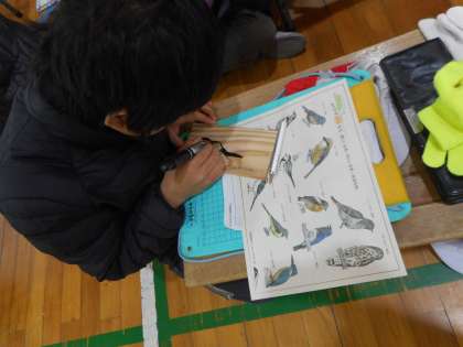 前半は,様々な鳥についてのお話を聞いたり,巣箱につける札を作ったりしました。