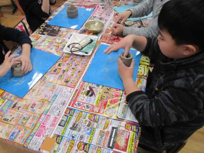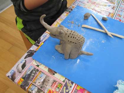 ソフトボールほどのねん土のかたまりを受け取った子どもたちは,おもいおもいに作品を作り出しました。おやじ&おかあさんの会の方々やボランティアの大学生にアドバイスをもらったり,助けてもらったりしながら,ねん土の感触を楽しみながら作品を作ることができました。