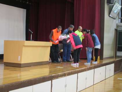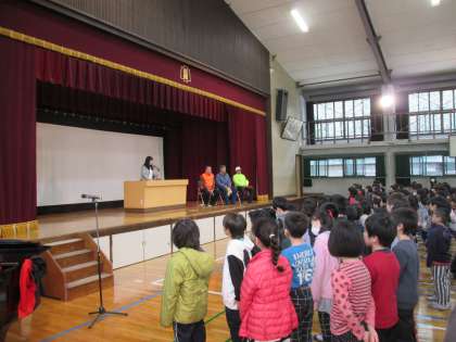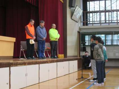 朝会に続き,一年間地域の見守り活動で大変お世話になった方々へ感謝の気持ちを伝える会を行いました。会では,6年生児童が全校児童を代表してお礼の言葉を述べるとともに,花束を贈呈しました。