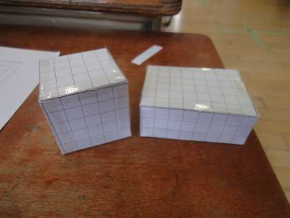 算数科では,箱の形について学習しています。面や辺,頂点はいくつあるのか,面の形はどうなっているのかなど,それぞれ持ってきた箱を見ながら考えています。今日は,直方体や立方体を工作用紙を使って作りました。それぞれ,面の数や辺の長さを意識しながら作り上げることができました。