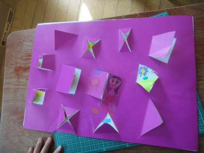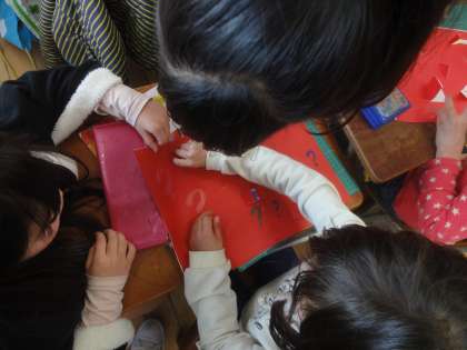 図画工作科「まどをひらいて」の学習で,絵合わせゲームを作りました。初めてカッターナイフを使う児童もたくさんいるため,使い方や使う時の約束をしっかりと確認しました。話を聞いた後は,実際にまどを作り,まどの中に絵を描き,絵合わせゲームを作りました。練習したまどの形だけでなく,想像力を働かせ,色々なまどの形を作っていました。出来上がったもので,友達とゲームも楽しみました。子どもたちはとても楽しかったようです。