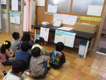 保健室の先生の話に真剣に耳を傾け,