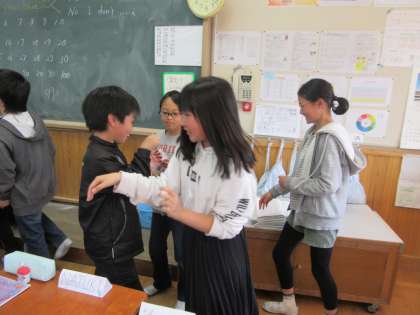子どもたちは,自分に配られたアルファベットのカードと同じものを持っている仲間を見つけるために,必死に訪ねて回りながら,表現に慣れ親しむことができました。
