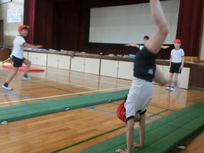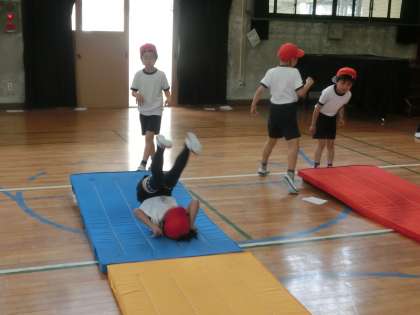 マット運動に,楽しみながら取り組んでいます。技カードを手に,何をどうすればうまくできるか,というコツを探しながら練習しました。だんだん上手になっていくことどもたちの様子を見ていて感心しました。