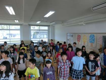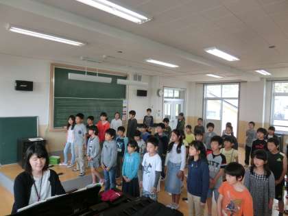 今日は,歌の重なりにチャレンジしました。学校で,重なる歌を歌うのは初めてです。子どもたちは,相手の歌声にも耳を傾けながら,楽しく練習していました。初めての体験に興奮気味に感想を話している様子がよかったです。