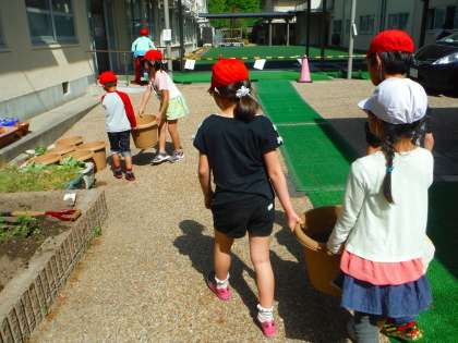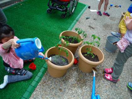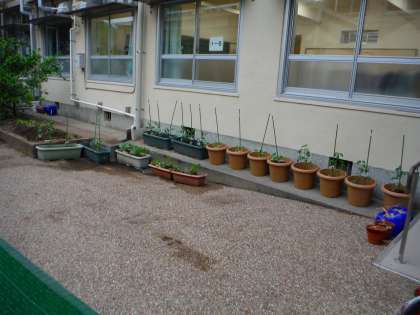 みんなの話しあいで決めた,ミニトマト,ナス,ピーマン,カボチャ,メロン,サツマイモの苗を植えました。大きく育ちますように。