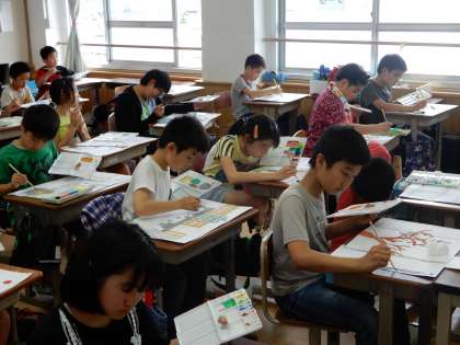 学校のお気に入りの場所を下書きした後、丁寧に彩色をしています。色を作りにもこだわりながら絵を完成させようと頑張っています。