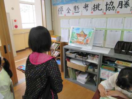 出来上がったものをホワイトボードに貼り,遠くから見て,気になるところを再度加筆していました。