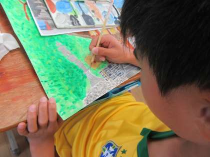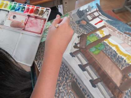 わら天神の絵が完成しました。最後の仕上げとして,面相筆を使って,細かい部分の彩色をしました。