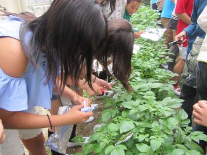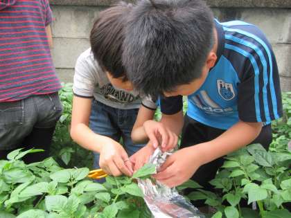 葉にアルミホイルをかけた物と,そうでないものを比較したり,葉に切り込みを入れた物とそうでないものを比較したりして,実験します。