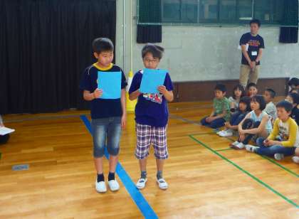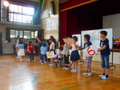 今日は,北下支部育成学級の「みんなよろしく大会」でした。支部の育成学級の友だちどうし,そして,金閣小学校の全校の子どもたちと,なかよくなろうの会でした。1・2・3年生とは歌あそび「よろしくね!」で,4・5・6年生とは「かもつ列車」で,楽しく交流しました。にじの子学級の子どもたちは,「はじめのことば」「学級紹介のうた」「おわりのことば」を担当しました。