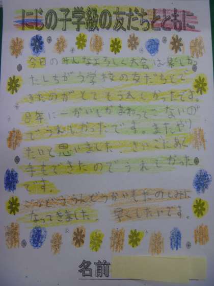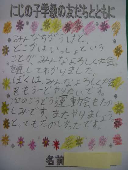 感想を書いて交流しました。今日のみんなよろしく大会を通してそれぞれが感じた思いを大切にしてほしいと思っています。