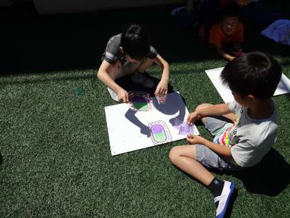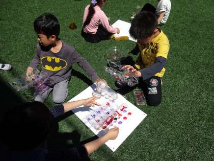 作れた作品にひかりを当てるために,中庭に出ました。今日はとても良いお天気だったので,作った作品がとてもきれいに映し出されていました。