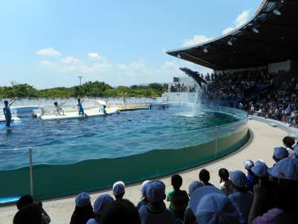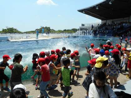 楽しみにしていたイルカショーを見ました。水族館から配られた笛の“プー”をイルカの鳴き声に合わせて吹いて、大盛り上がりでした。ご飯を食べた後は、イルカとガラス越しに遊びました。