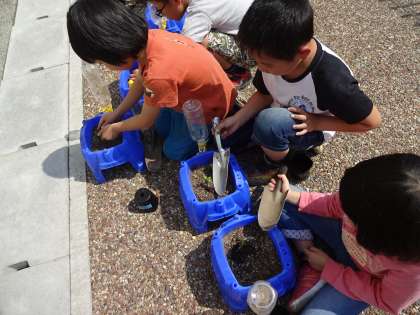生活科の学習で,先日より一人一粒の種をまいたミニトマトが少し大きくなりました。そこで,黒ポットから植木鉢に植え替えました。小さな苗の小さな命をとても大切に扱っていました。