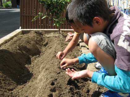 畑のうねをつくって,「だいこん」と「九条ネギ」の種を植えました。