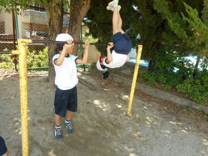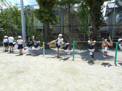 体育では,今,鉄棒をしています。地球まわりや足かけふりなど,いろいろな技に挑戦しています。できた技は,ワークシートに色を塗っています。たくさん塗れるよう,がんばっています。