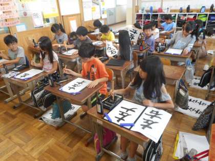 筆順と字形に気を付けて「左右」という字を書きました。横の辺の長さ,はらいの長さなどが難しく,苦戦する様子もありましたが,がんばって書き切りました。