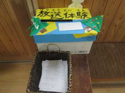 現在放送委員会では、放送体験をしたい人を募集しています。給食時間の放送を経験することができるのです。低・中学年の子どもたちは目を輝かせながら、応募用紙に記入し、箱に入れていました。放送が楽しみになります。
