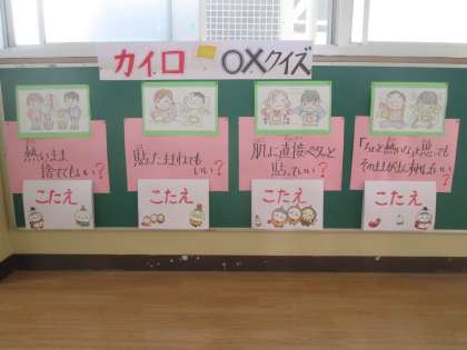 そのカイロについて、保健室前に掲示してあります。一つ間違えると大変なことになります。子どもたちは興味をもって掲示のクイズを考えていました。