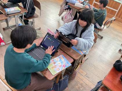 外国語では「This is for you.」の学習で、色や形、ほしいものを訪ねたり伝えたりする英語に親しみ、グリーティングカードを作ります。今日は学習の最後、お互いに英語でほしい形を伝え、それをタブレット上で送り合い、グリーティングカードを作りました。上手に伝え合うことができていました。