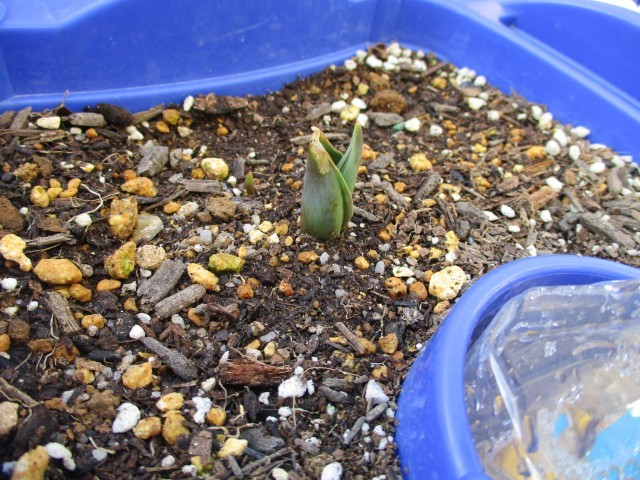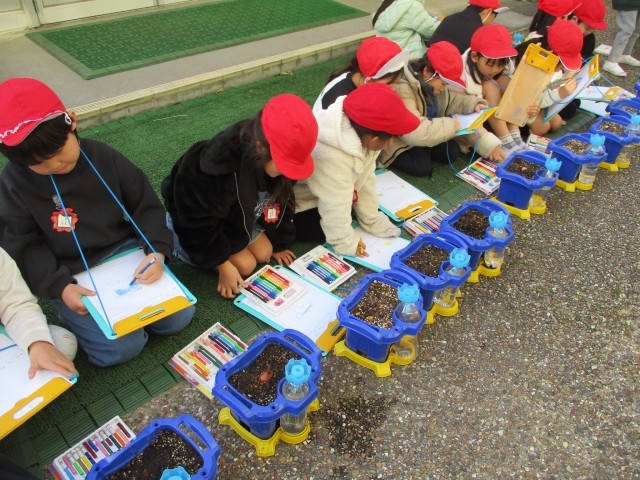 球根から芽が出てきて嬉しそうに観察をしていました。
