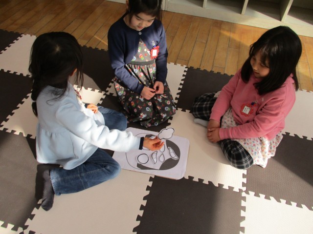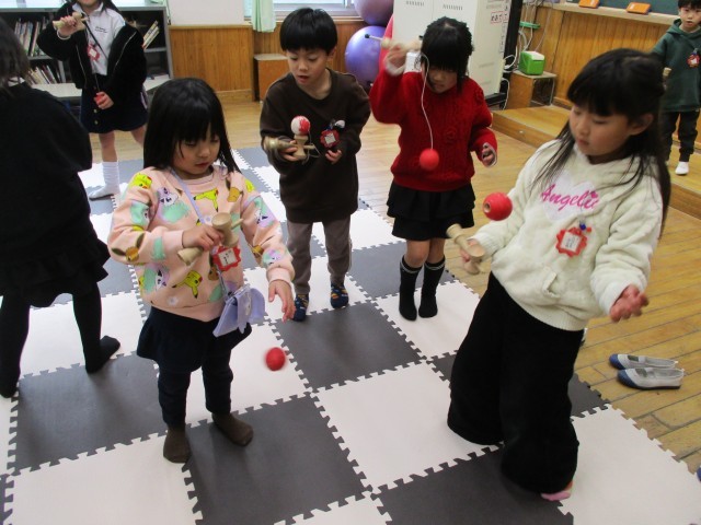 「お手玉」「けん玉」「コマ」「ふくわらい」「かるた」自分が挑戦したい遊びに取り組んでいます。
