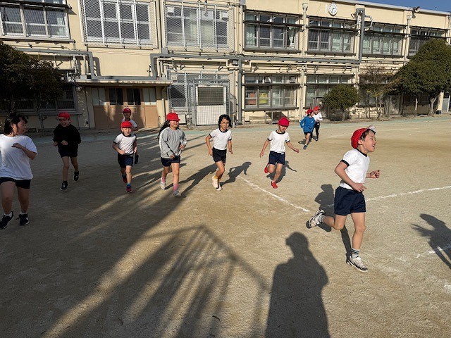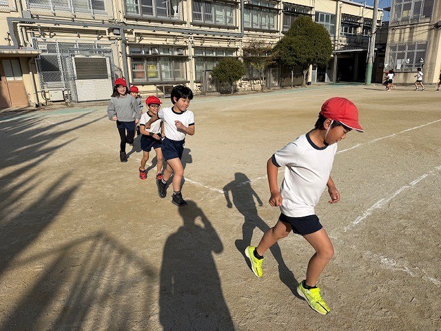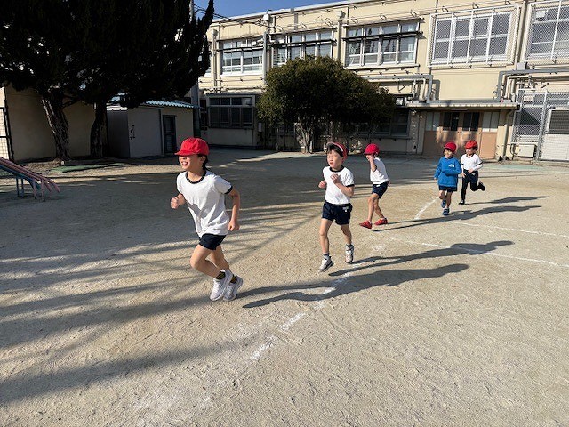 寒い中持久走「ゆっくりペース走」に挑戦しました。最後までスピードを変えずに走り続けることを目標に、最初はグループの人とスピードを合わせて、後半は自分のペースで走りました。最後まで一生懸命走る姿がかっこよかったです。