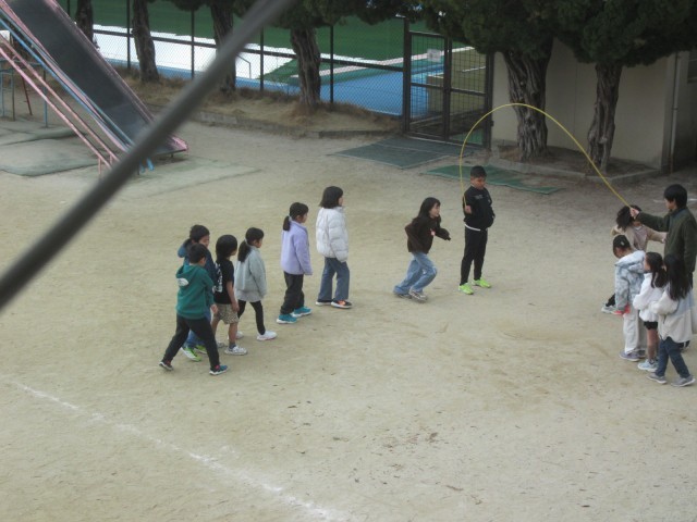 大繩大会に向けて休み時間に低学年が練習をしていました。がんばってたくさん跳ぼうと練習をしている姿はかっこいいですね。がんばってね。