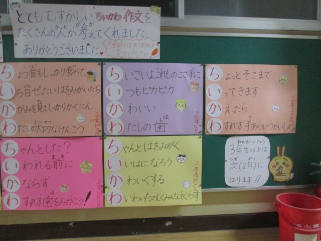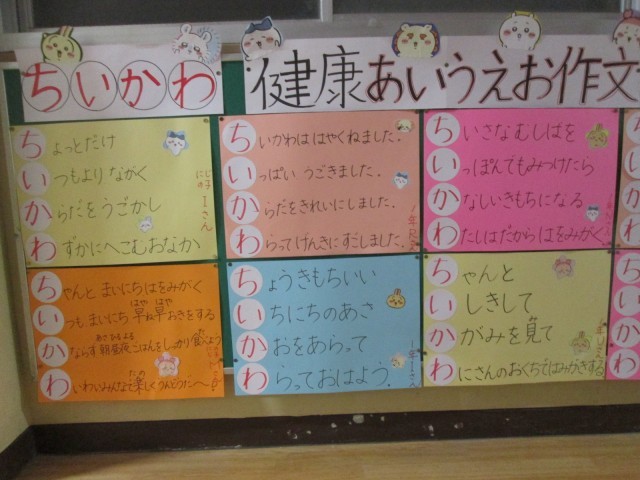 保健室前の掲示です。とってもかわいいあいうえお作文が掲示してあります。低学年が作った作文で、思わず笑顔になるものばかり。とっても上手に出来上がっています。