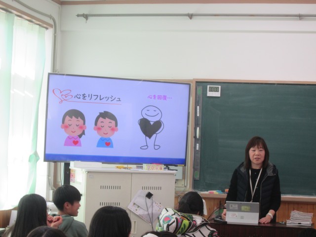 5年生に養護教諭が「ストレスとの上手な付き合い方」について話をしました。。誰しもストレスはあるものです。これをいかに解消させていくかが大切です。子どもにもストレスはあります。ネガティブにとらえるのではなく、明るく付き合っていくことが大切ですね。
