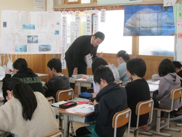 6年生の研究授業がありました。国語の学習です。単元は「海の命」です。今日は「太一はなぜクエを殺さなかったのか」というめあてについて考えました。さすが6年生と思わせる学習に向かう態度で、とっても立派でした。6年間の集大成ともいえる授業でした。