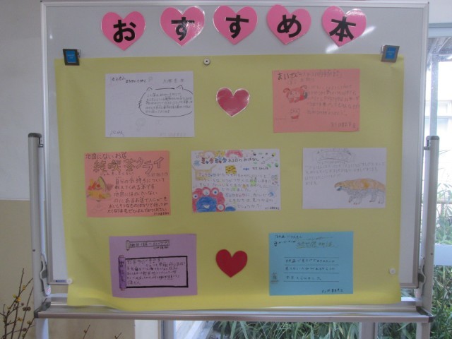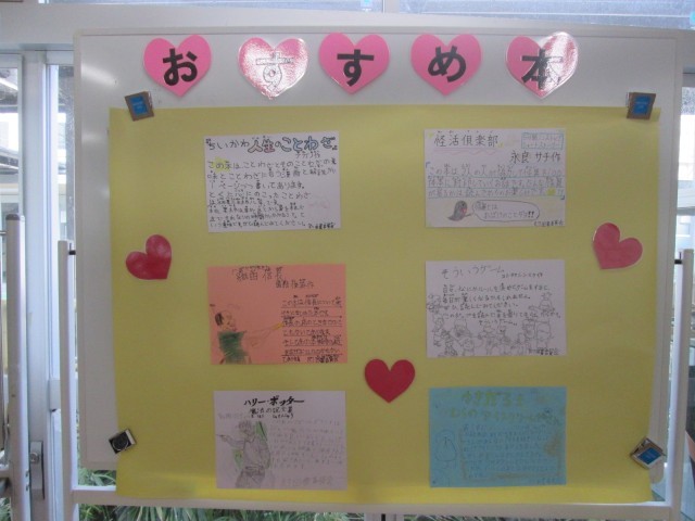 シューズボックスに図書委員会からのおすすめの本が紹介されています。手に取って読んでいる子どももいました。図書室にはたくさんのすてきな本があります。図書委員会の人がおすすめする本を一度読んでほしいです。