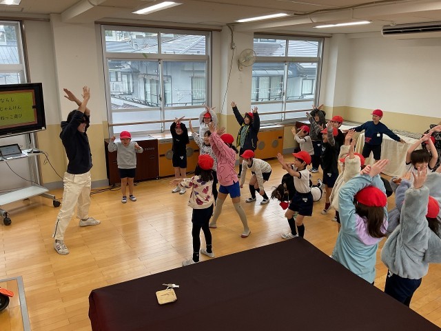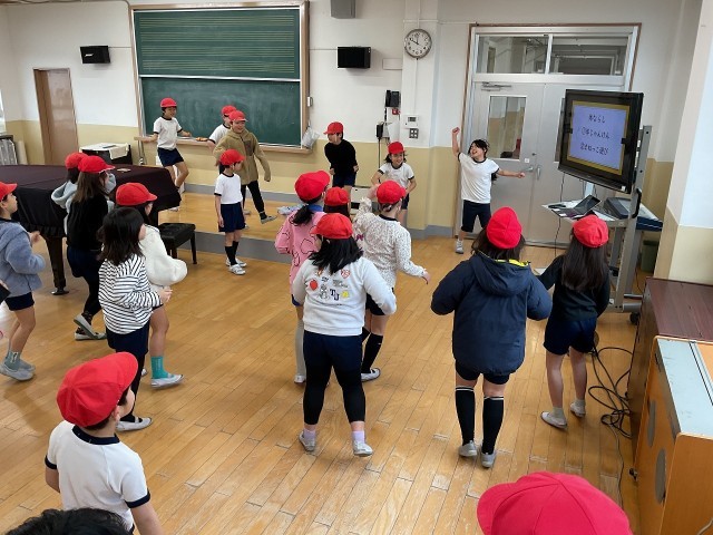 今日は雨で体育のサッカーができず…学年みんなでリズムダンスの学習をしました。リズムに乗りながら、おへそを動かすことを意識してダンスしました。体じゃんけん、まねっこダンス、動物の動き…みんな楽しそうにリズムに乗ることができました。